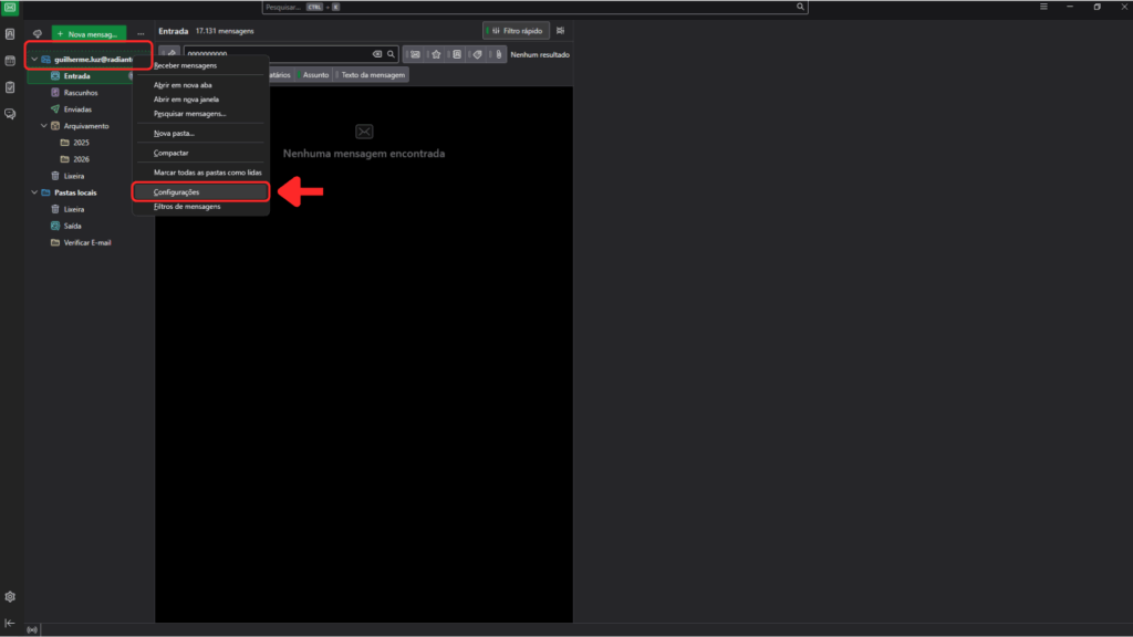 No painel lateral, clique com o botão direito sobre o seu endereço de e-mail e selecione Configurações.