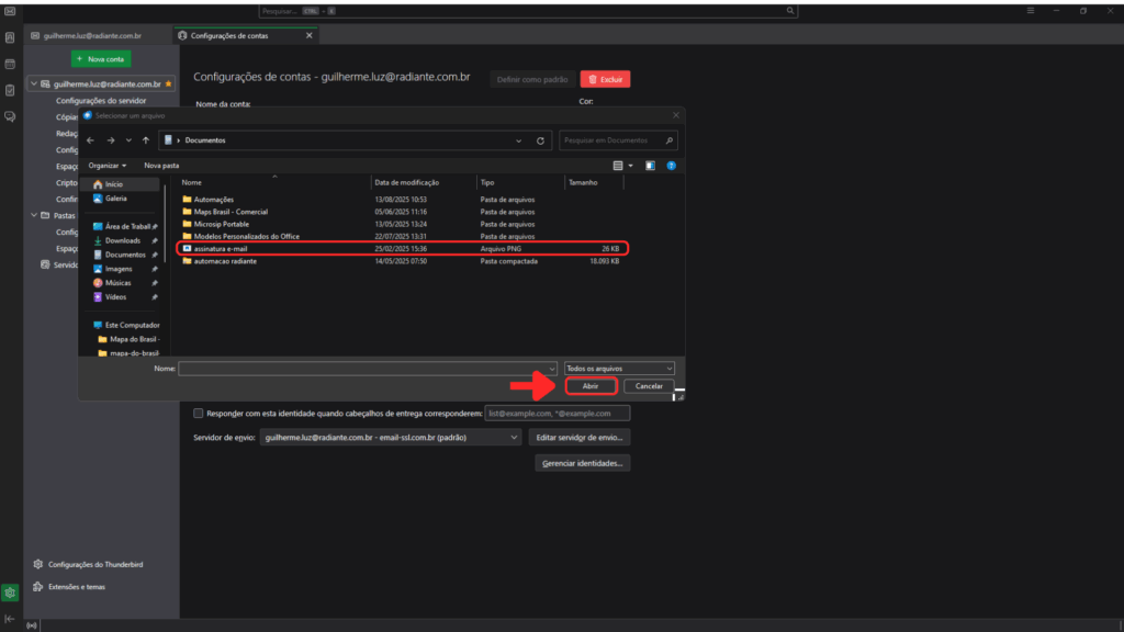 Navegue até a pasta Documentos, selecione o arquivo da assinatura salvo anteriormente e clique em Abrir.