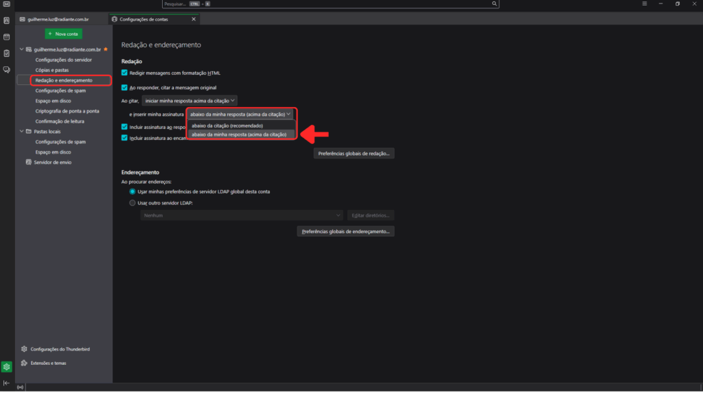 Ainda nas configurações, clique em Redação e Endereçamento e marque a opção: